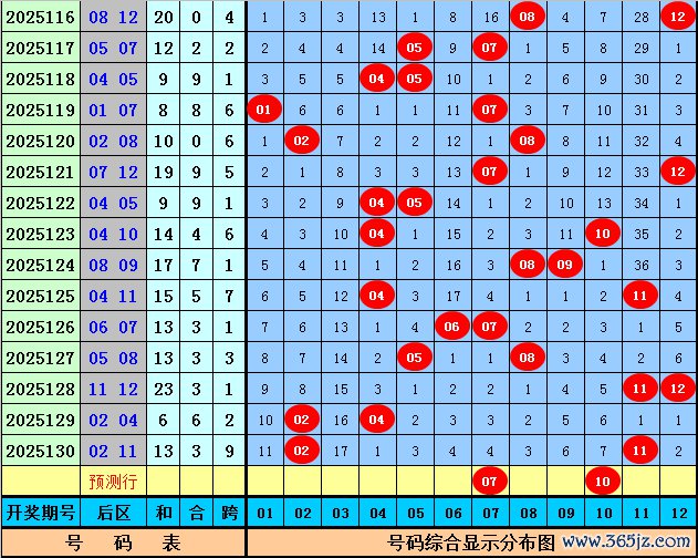 后区上期开出奖号02和11,该组合历史上出现了48次,其下期奖号频次分袂为:号码06出现11次,05、10、12出现10次,01、03出现9次,02出现8次,11出现7次,07出现6次,08、09出现5次,04出现4次,本期后区参考号码03、07、09、10,精选两码07和10。